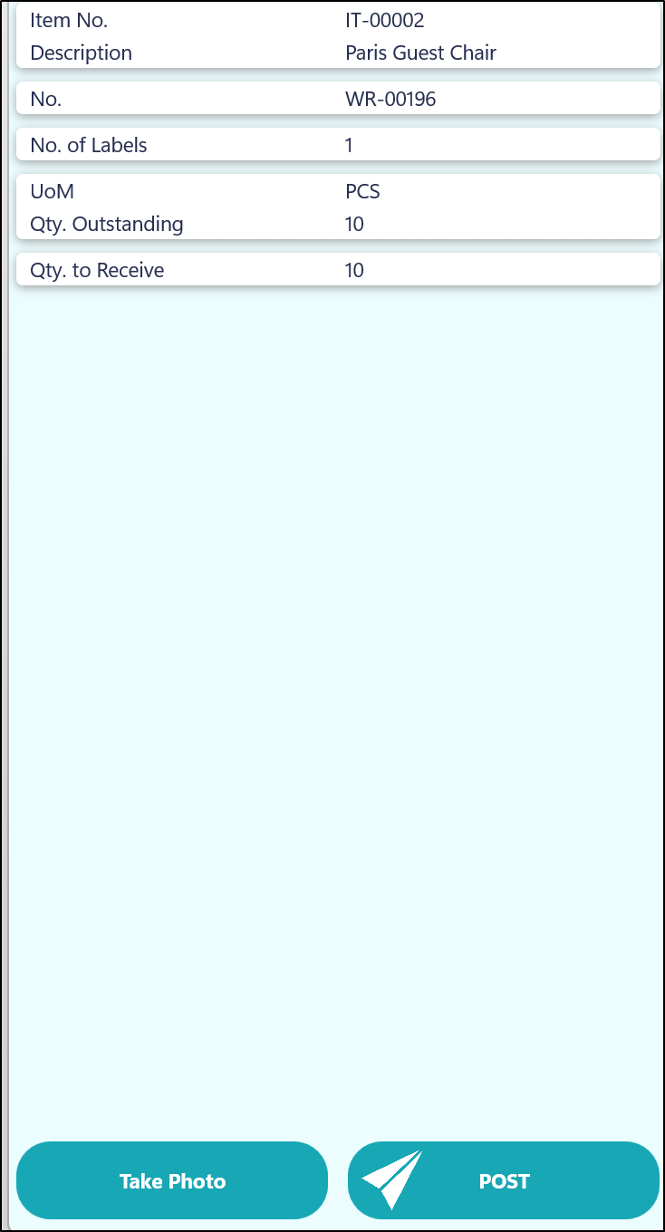 At this point, you can also choose the Take Photo option if you would like to take a photo of the Items you have received. If you do take one, then it will be stored against the Posted Purchase Receipt Line in Business Central which will be automatically created once the Receipt has been posted.