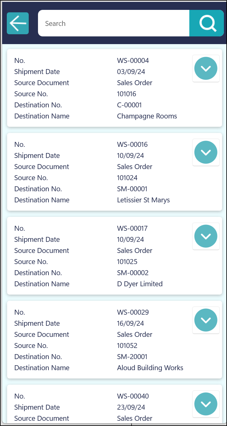 Alternatively, the user can also click on the Warehouse Shipments button at the bottom of the screen in order to display a list of all the Warehouse Shipments. They can then either use the Search Function to search for a specific Shipment or they can scroll through the list and select the relevant one.