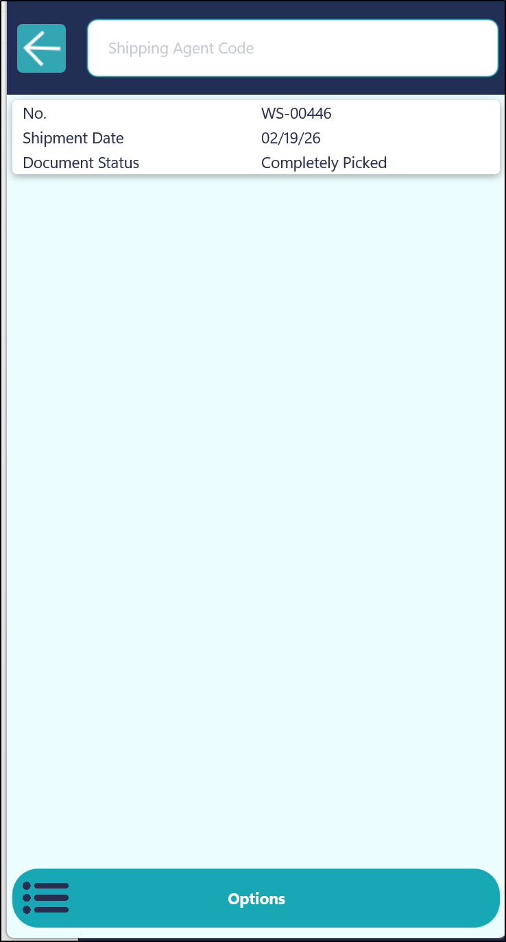 The Options button can be selected if required. This will allow the user to be able to select from the list of Shipping Agents that have been setup in Business Central or allow the User to take a Photo. This could be useful if you need to take a picture of the items prior to being shipped to prove that there is no damage to them and that they have actually been sent etc.