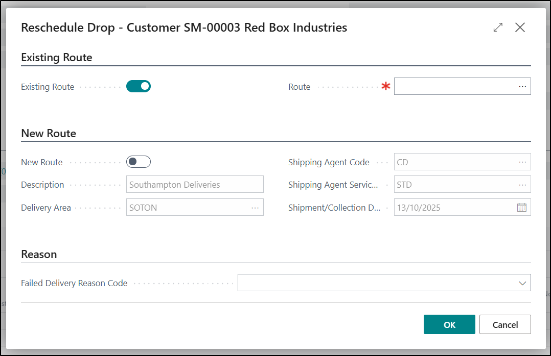 If rescheduling to a new Route, enable the New Route option and complete the Delivery Area, Shipping Agent, Shipping Agent Service and Shipment Date. This will then create the new Route and create a drop to re-attempt the delivery.