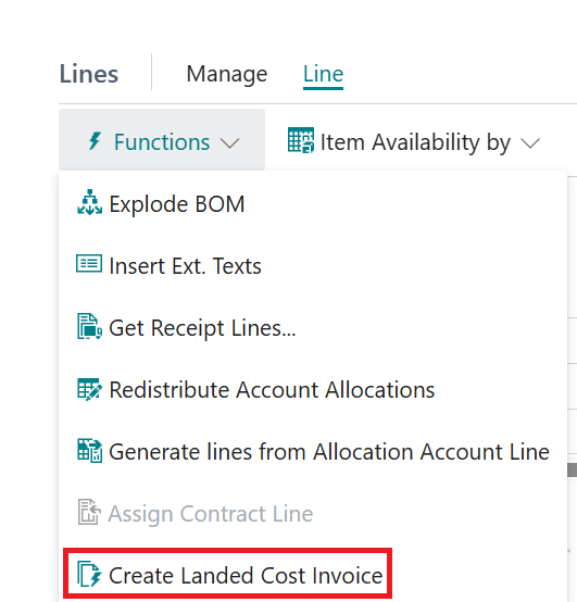 The Landed Cost Wizard has been created to allow for easier matching of costs to Purchase Orders and automation of Invoice Line creation. After creating a new Purchase Invoice, the Create Landed Cost Invoice function can be used which is available from the Functions menu of the Lines section on the Purchase Invoice document, as shown below.