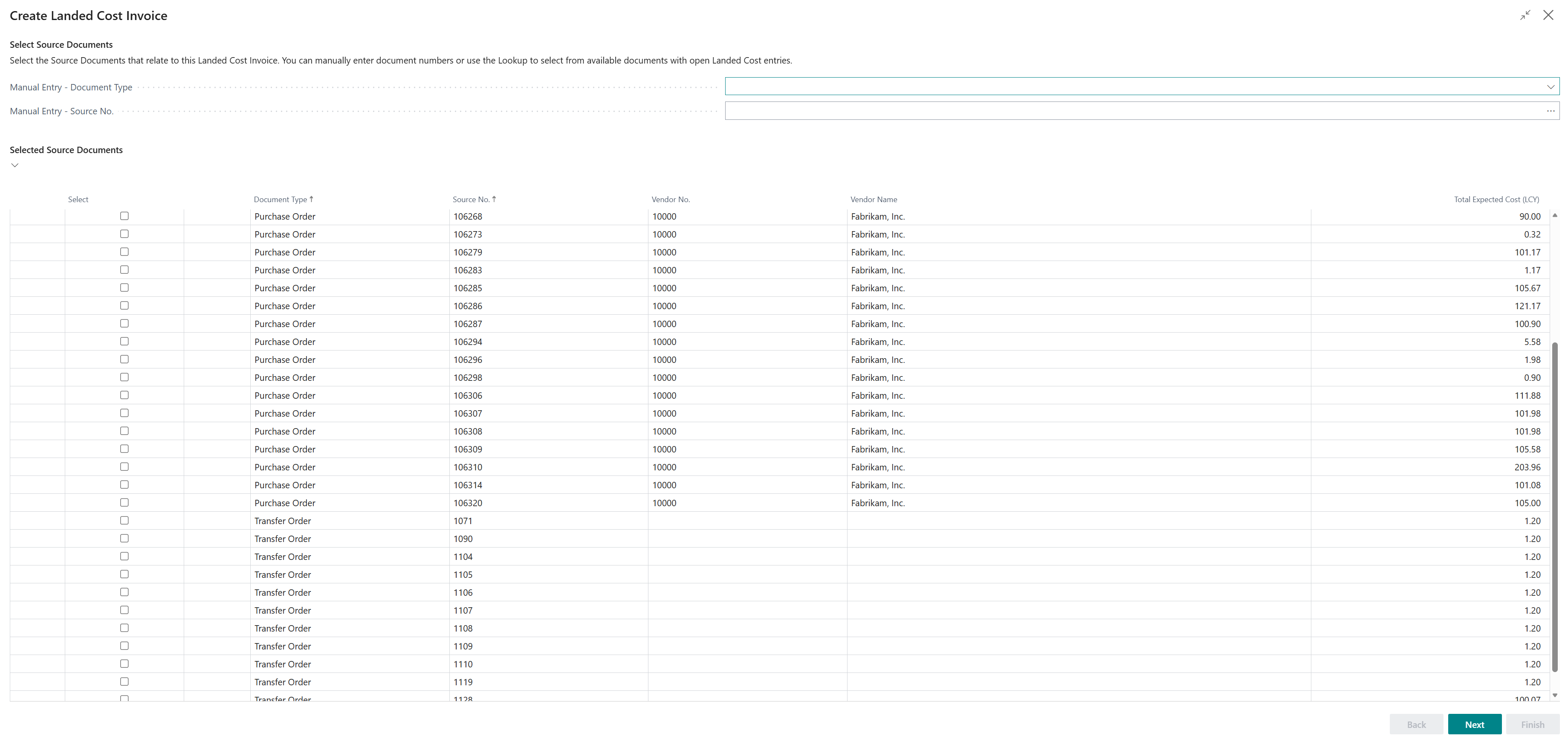 Simply select the Purchase Orders and Transfer Orders that you are processing against the Invoice, which you can do by entering the Source Document No. manually or using the lookup to select multiple documents. Alternatively you can simply press the Select check box against the relevant Documents on screen.