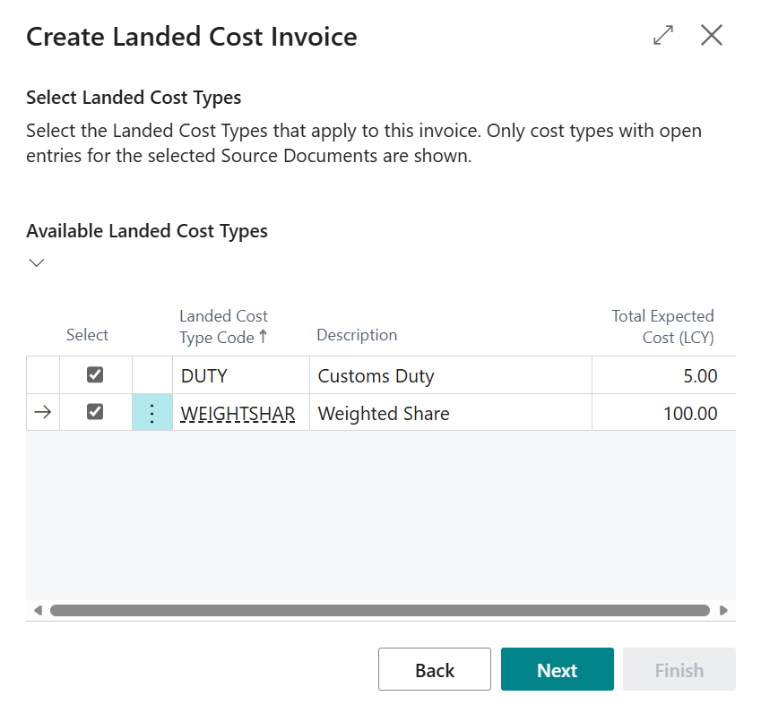 On the Landed Cost Types screen, simply use the Select attribute to mark the Landed Costs that you are applying the Invoice against. Referring to the "Landed Cost Setup" you are able to control whether to automatically select all Cost Types be activating the Invoice Wizard - Default Select All Cost Types attribute.
