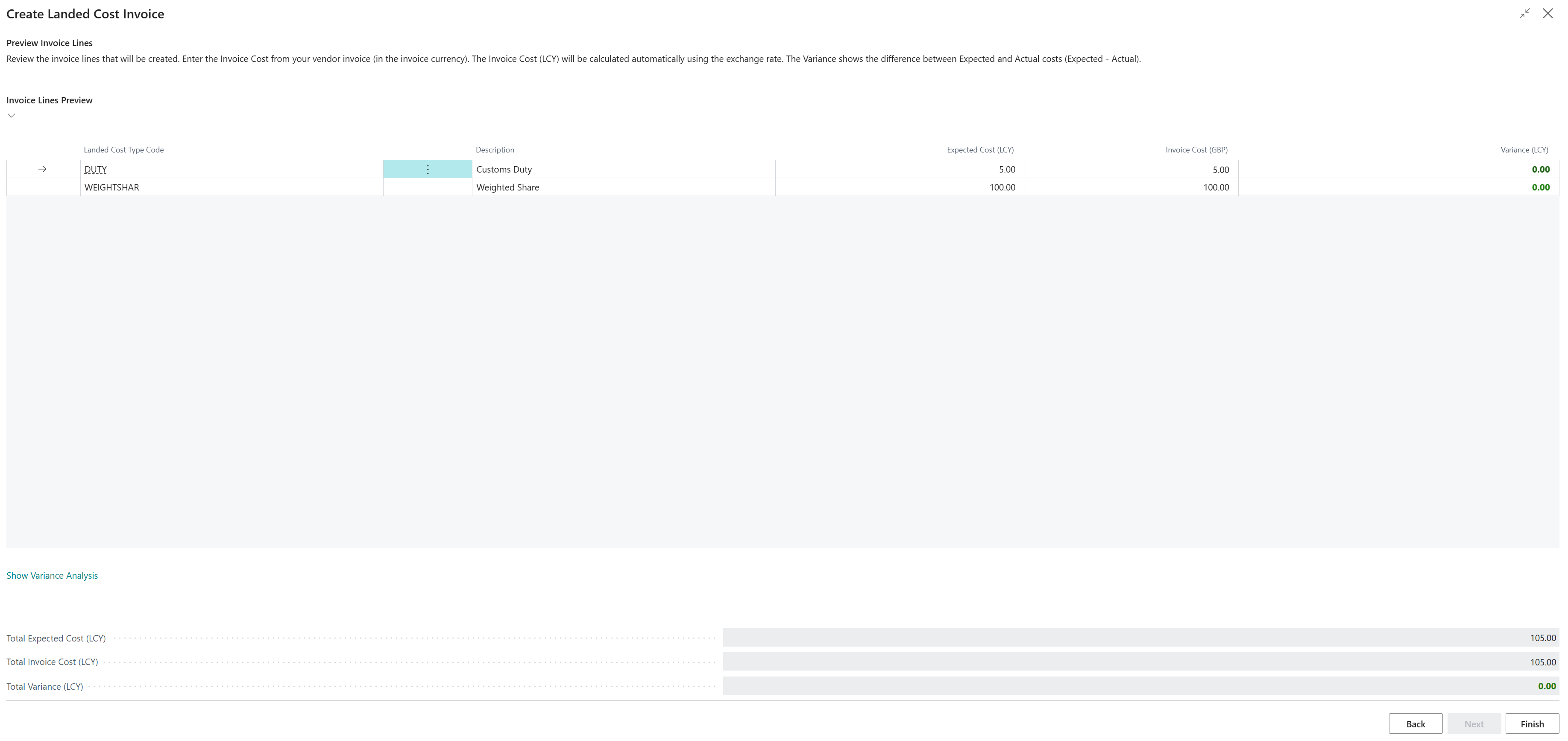 Also referring to the above screenshot, you can press the Show Variance Analysis link to see how the cost will be applied and you are able to adjust the apportionment if required.