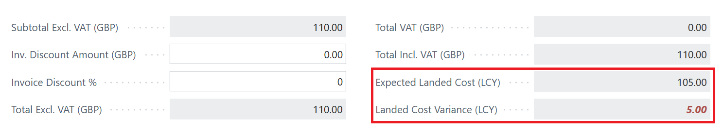 Landed Cost information is also shown on the Totals section of the Purchase Invoice.