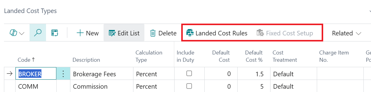 The Landed Cost Rules and Fixed Cost Setup for a Landed Cost Type cannot be used at the same time for the same type of cost, therefore if you have existing Landed Cost Rules in place a specific cost you will not be able to access the "Fixed Cost Setup" screen. Similarly if you have a cost type that Fixed Cost Setup in place, you cannot then assign "Landed Cost Rules" for the same cost type.