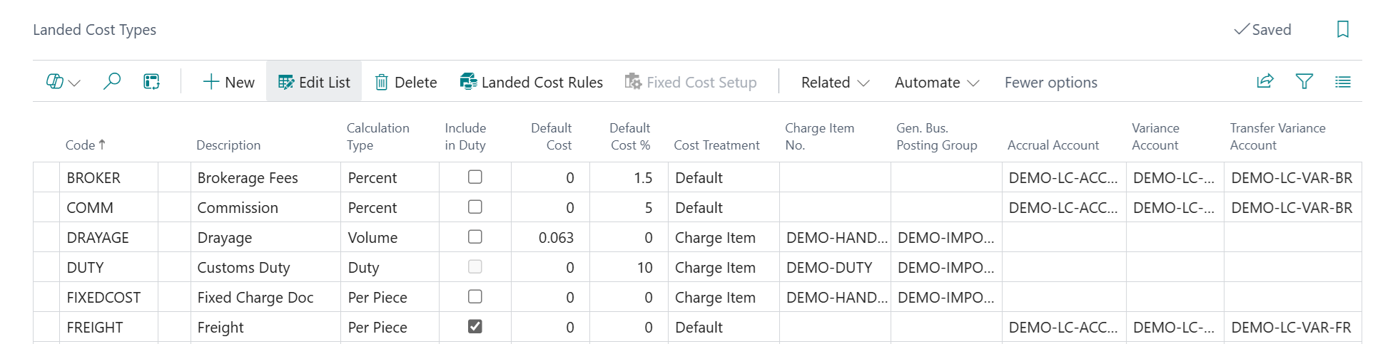 For each Landed Cost Type you will need to specify an Accrual Account, which will be the G/L Account into which the expected cost will be posted (for the relevant Landed Cost Type) by the system on receipt of the purchase order. Once the cost has been invoiced the expected cost is reversed and the actual costs are posted to the landed cost ledger entries. You should also have an Inventory Accrual Acc. (Interim) stated on your General Posting Setup for Items that will have landed costs as this is where the expected costs are posted on receipting the order. Also within the General Posting Setup screen, you should also set the Overhead Applied account to the same as the Inventory Accrual Acc (Interim). This will ensure the landed costs are posted correctly within the general ledger. For each Landed Cost Type you will need to specify a Variance Account which will be used to post any differences between the expected cost (recorded on receipt) and actual costs that are posted for Purchase Receipts when invoicing the Landed Cost. If you are using Landed Costs for Transfer Orders then the Transfer Variance Account should be specified and this is used for both expected and actual landed cost postings as Transfer Order postings (as per standard Business Central functionality) are always posted as Actual Costs for inventory costing purposes. Note: you can have a separate Accrual account per "Landed Cost Type" if you wish to ensure clarity in reporting. The financial postings that are created when using the Default Cost Treatment method are detailed here. |