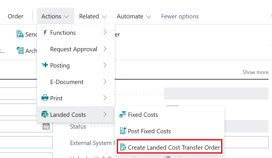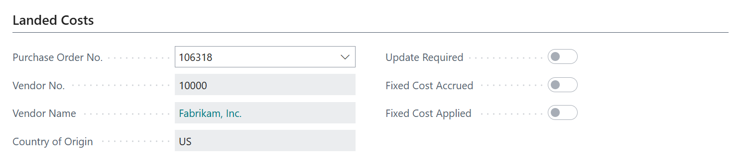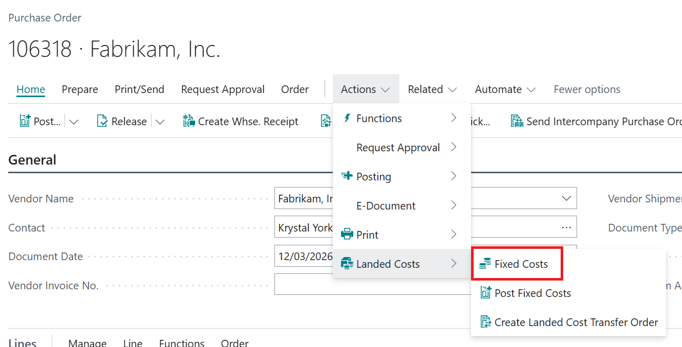 Additionally (from Version 5.0.0) if you setup any Fixed Cost for Purchase Orders then, depending on the Purchase Order attributes (e.g. Vendor No., Location Code) any relevant Fixed Costs will be retrieved. To view any Fixed Costs you can access them by selecting Fixed Costs from the Landed Costs menu option.