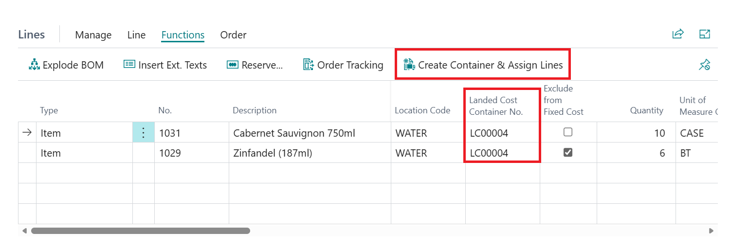 Within the Purchase Order it is possible to view and manually assign an Item to a pre-existing "Landed Cost Container" and the Create Container & Assign Lines functionality can be used to automatically create a new "Landed Cost Container" and assign Items on-the-fly. This functionality will use the "No. Series" assigned to Container Nos. on the "Landed Cost Setup" screen.