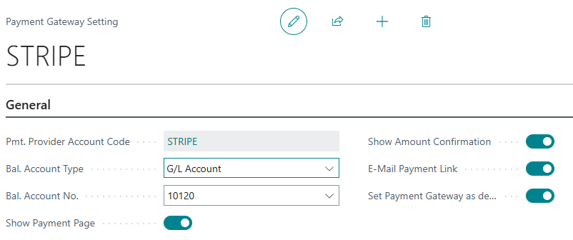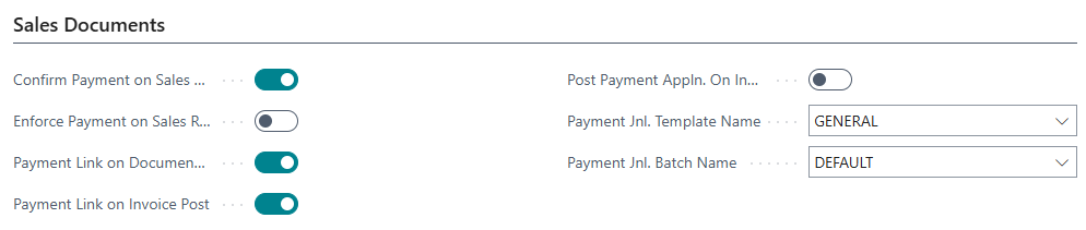 The Post Payment Appln. On Invoice specifies whether Payment Gateway payments for the sales document should be automatically posted and applied on posting the sales invoice. This means, when the Sales Invoice is posted, Business Central will automatically create a journal entry for the Payment and post this, applying it to the relevant invoice, therefore leaving the Customer Ledger Entry with zero Remaining Amount. In order to do this, the Payment Jnl. Template Name and Payment Jnl. Batch Name should be set so Business Central knows which Journal and batch to use when creating and posting this entry.