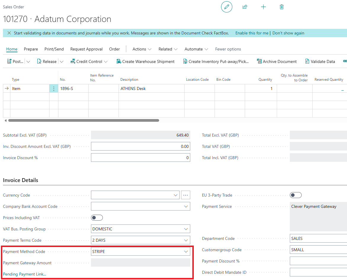 A Payment Provider Account will be pulled through from the Customer Card with the Payment Method Code if one has been set. The Payment Gateway Amount field will be empty initially but will be completed after payment has been taken, showing the amount received through the Payment Gateway. This will update if more than 1 payment is made.