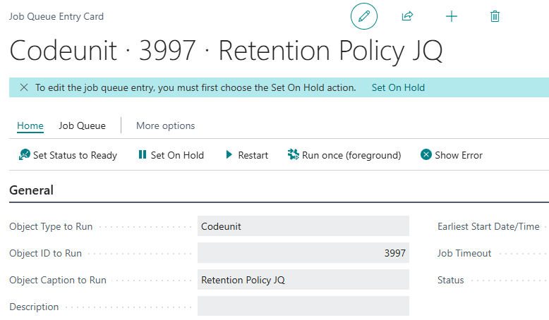 If you'd prefer to use a Job Queue to automatically clear expired links down, turn 'off' the Manual toggle, go to Navigate in the ribbon and select Job Queue Entries. Update your job queue recurrence as you wish and Set Status to Ready. Again, you must ensure the Retention Policy is Enabled.