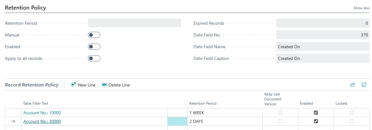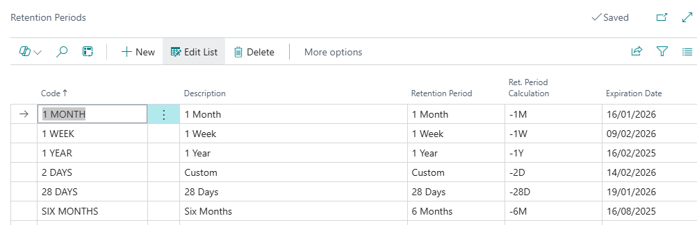 Ensure you create a Code, populate the Description and then confirm from the dropdown what Retention Period you are creating. If the one you want to use does not exist, use 'Custom'. Confirm the Ret.Period Calculation, i..e how many days, weeks, months etc Business Central should calculate for this period. The shortest period you can specify is '2D'.