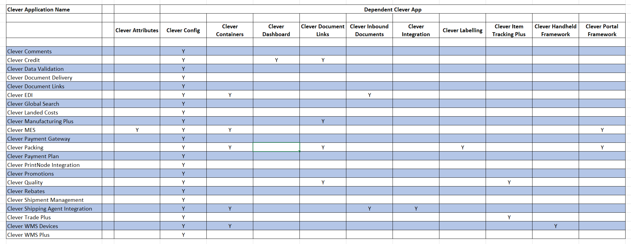 The below Matrix shows the dependant Apps for each of our Clever Apps.